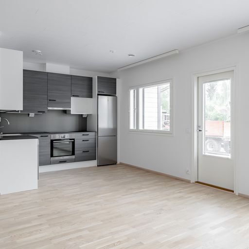 - jääkaappi/pakastin, induktioliesi, erillisuuni, astianpesukone ja liesituuletin. Tasot laminaattia, keittiön kalusteväliin asennetaan välitilalevy. Ovet, tasot, vetimet valittavissa kalustetoimittajalta. Lattia parkettia tai vinyyliä, seinät maalattu.