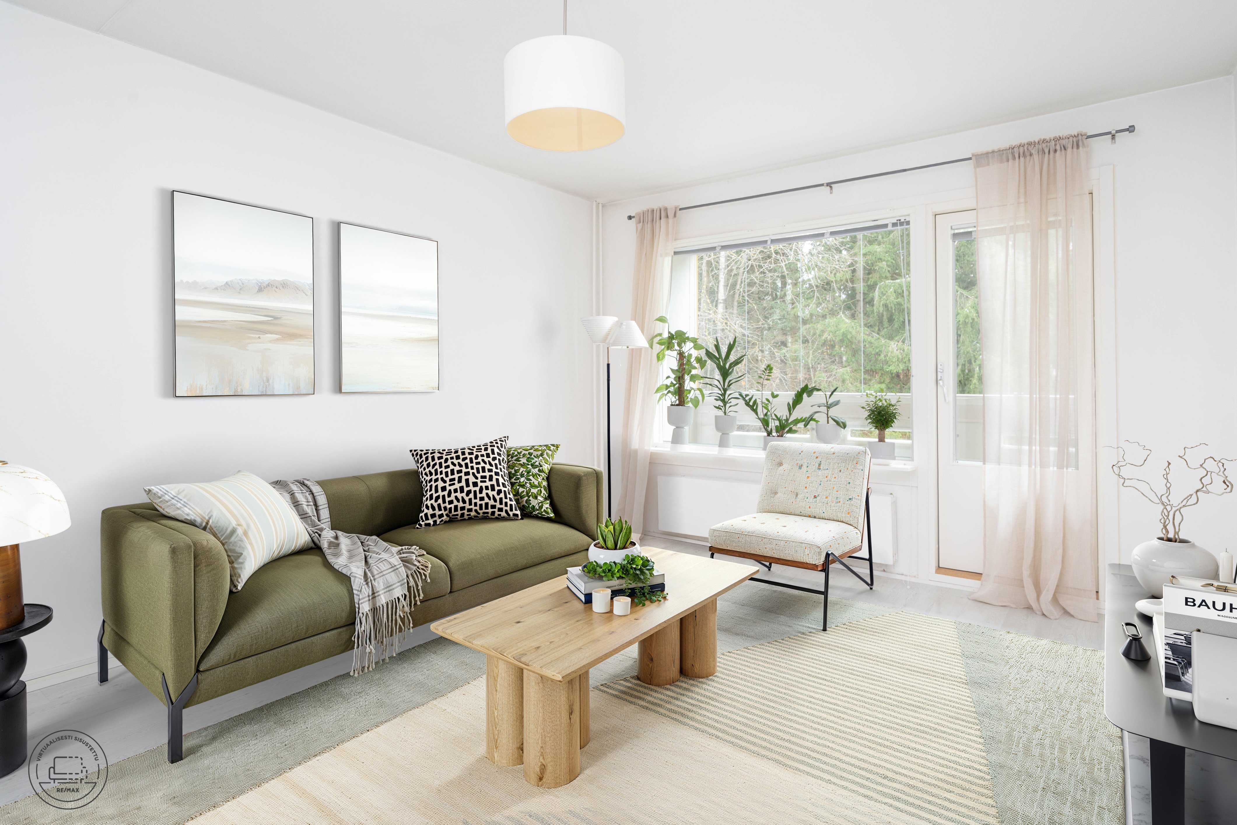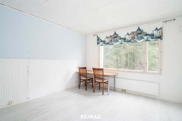 Avara olohuone on tämän kodin sydän – tila, jossa on helppo viihtyä. Olohuoneessa on hyvin tilaa oleskeluun, työskentelyyn tai vaikka sohvaryhmälle. Iso ikkuna tekee tilasta raikkaan ja ilmavan. Keittiö on käytännöllinen ja selkeälinjainen: säilytystilaa ja paikka ruokailuryhmälle tekevät siitä toimivan kokonaisuuden niin arkeen kuin juhlaan.
