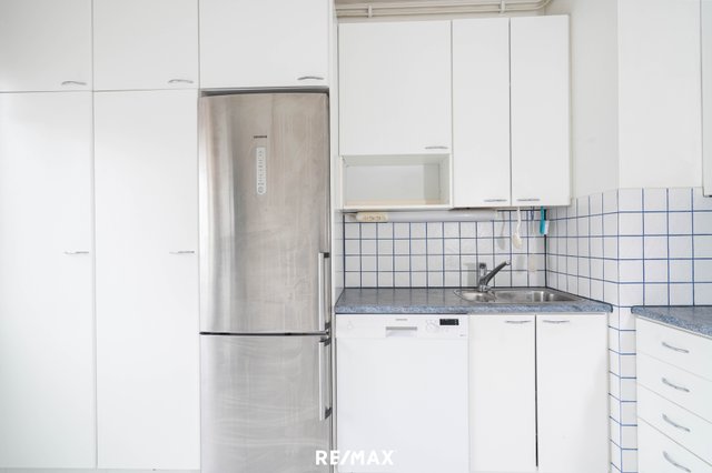 - Keittiössä on pesualtaan ja jääkaapin välissä pöytätilaa ja yläkaappi.