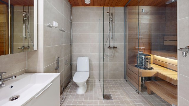 - Lattialämmitys, pesukoneliitäntä, suihku, suihkuseinä, ja wc-istuin