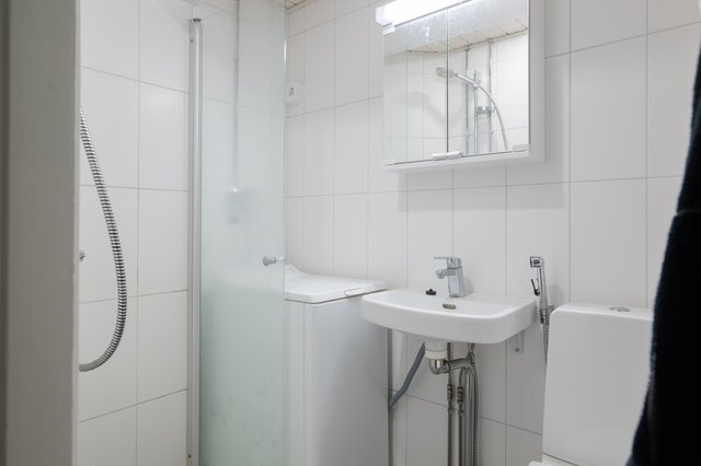 - WC-istuin, suihkuseinä, pesukoneliitäntä, peilikaappi, pesuallas, ja bidee-suihku