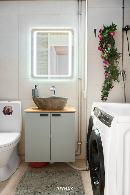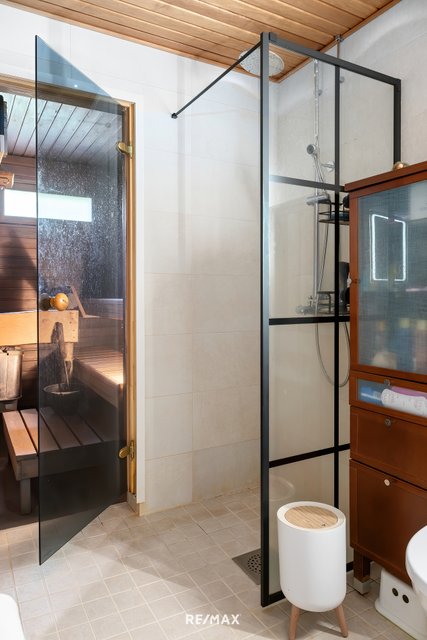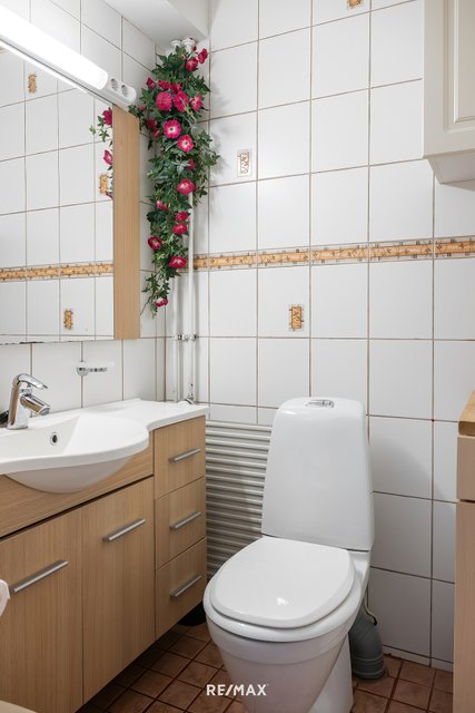 - WC-istuin, suihkuseinä, suihku, pesukoneliitäntä, lattialämmitys, peili, pesuallas, ja allaskaappi