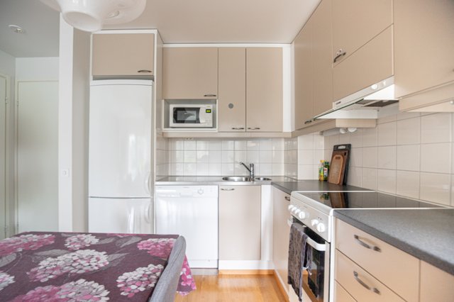 - Jääkaappipakastin, liesi, astianpesukone, ja liesituuletin