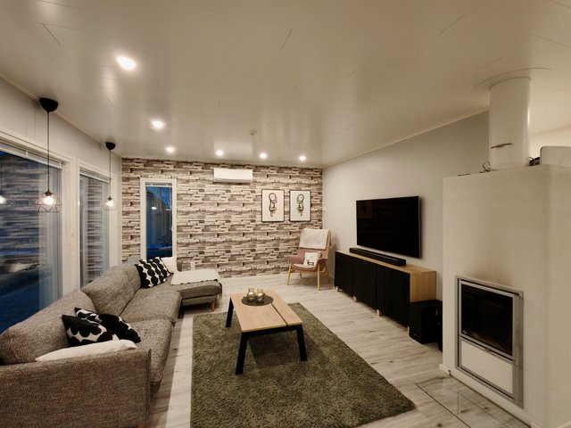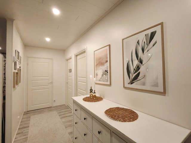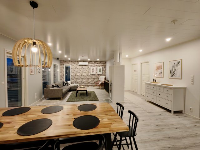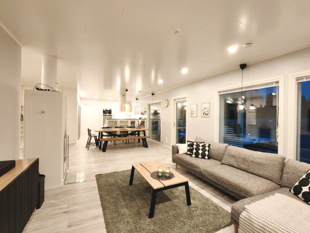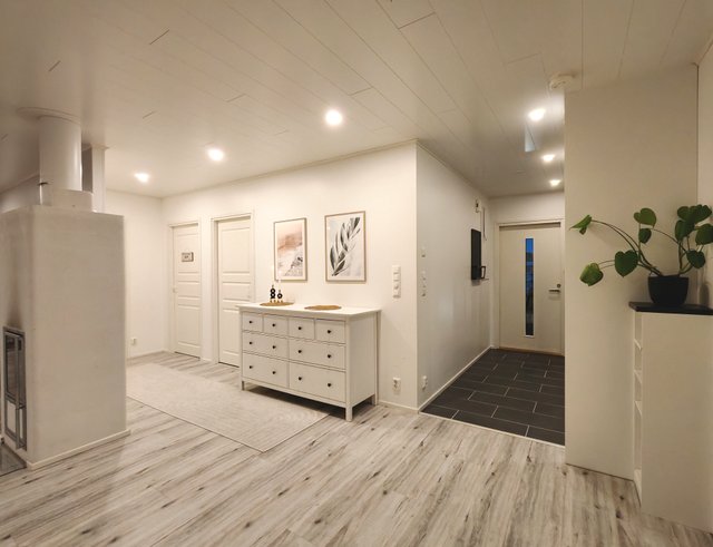 - Lämmin autotalli (25 m2), sähköinen nosto-ovi, erillinen käyntiovi, sähköauton latauspistoke. Lämmin varasto/tekninen tila (9 m2), erillinen käyntiovi.