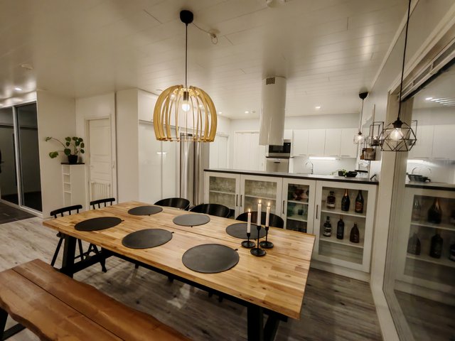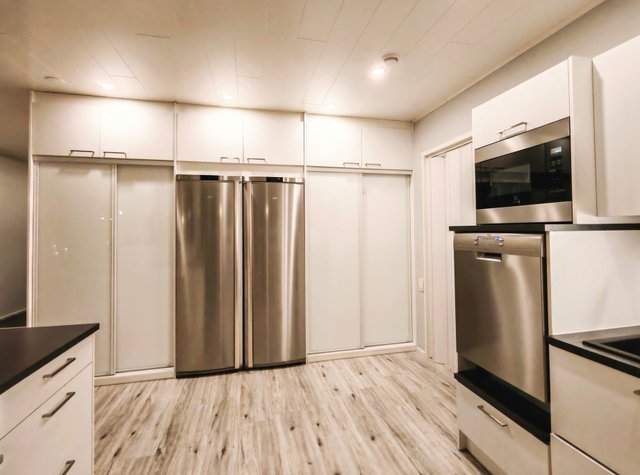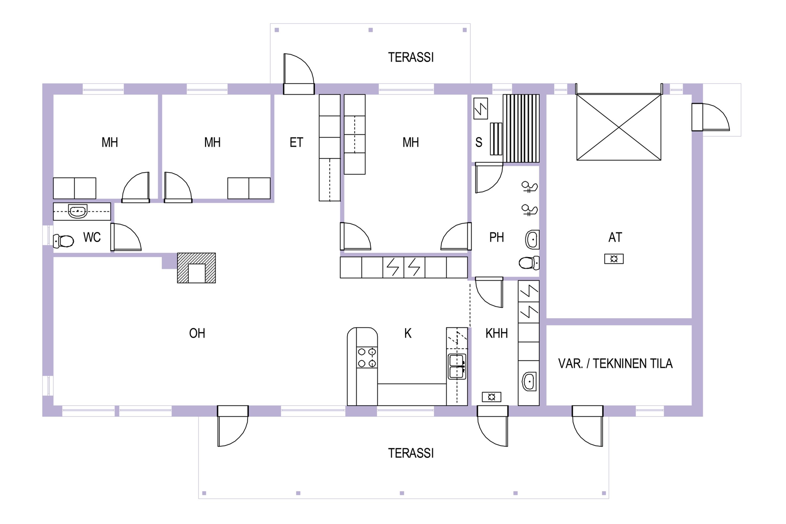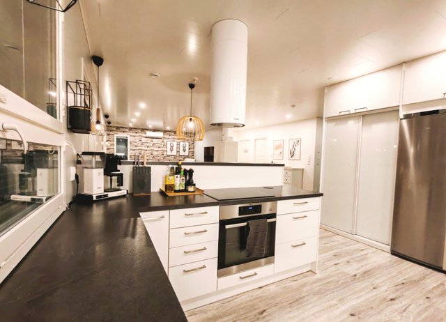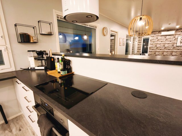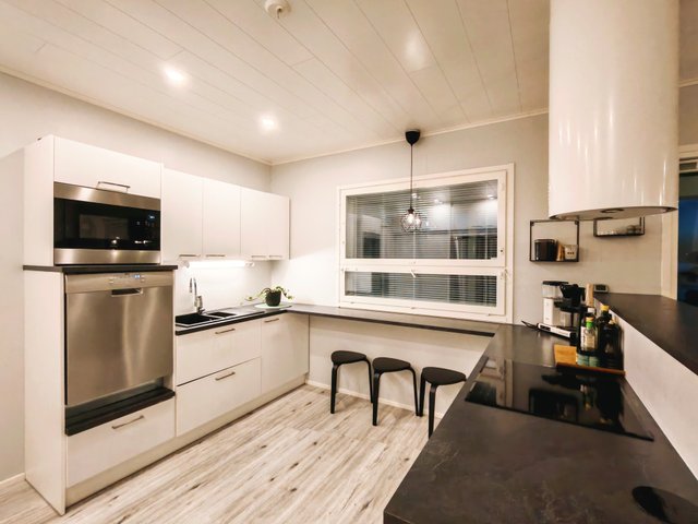 - Jääkaappi, erillinen pakastin, liesi, erillisuuni, astianpesukone, mikroaaltouuni, keittiösaareke, ja liesituuletin