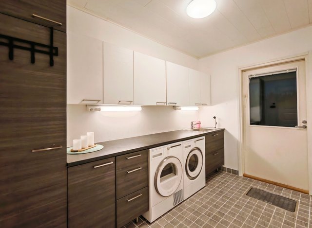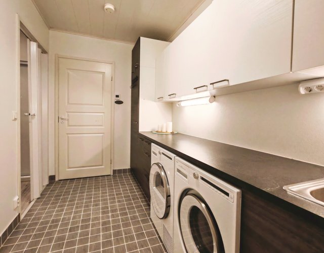 - Pesukoneliitäntä, pesukone, kuivausrumpu, lattialämmitys, pesuallas, kurapiste, pyykkikaapit, keskuspölynimurivaraus, ja pöytätaso