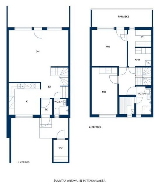 Alakerrasta löytyy valoisa olohuone, josta on käynti omalle terassille, sekä erillinen keittiö. Yläkerrassa sijaitsevat kaksi tilavaa makuuhuonetta, kylpyhuone, sauna, iso kodinhoitohuone ja tilava parveke. Tarvittaessa alakertaan on mahdollista toteuttaa kolmas makuuhuone.