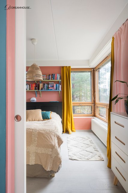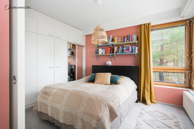 Makuuhuone on tilava johon mahtuu leveämpikin sänky. Makuuhuoneessa on hyvin säilytystilaa kaapeissa ja kulman kahden puolen olevat ikkunat tuovat vehreyttä tilaan pihan puista.