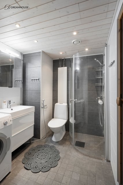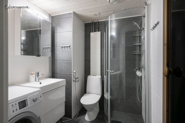 - WC-istuin, suihku, suihkuseinä, pesukoneliitäntä, pesuallas, allaskaappi, bidee-suihku, ja peilikaappi