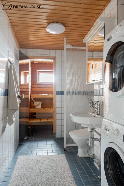 - WC-istuin, suihku, pesukoneliitäntä, peilikaappi, pesuallas, bidee-suihku, allaskaappi, ja lattialämmitys