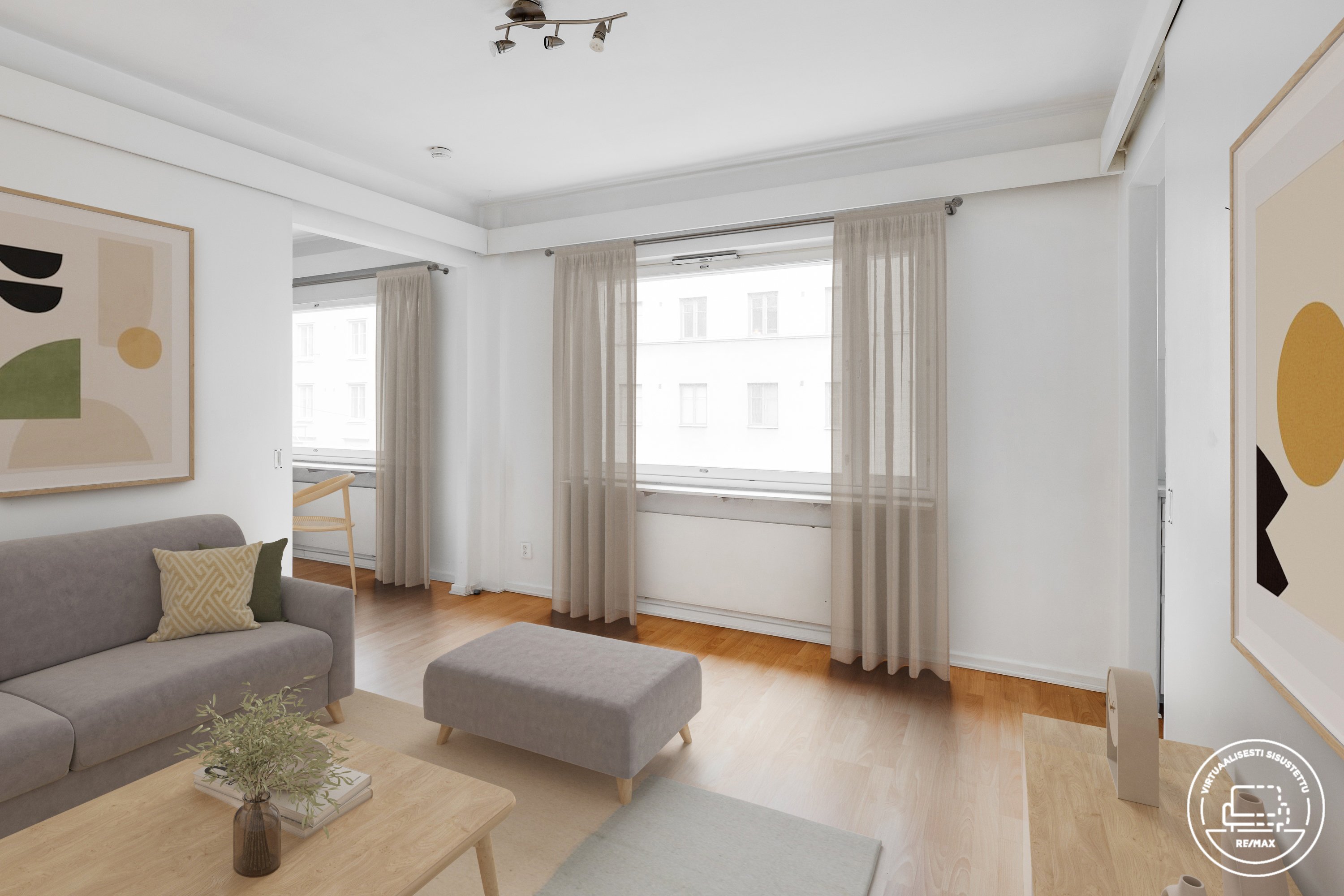 Asunnossa on olohuone, makuuhuone, keittokomero sekä linjasaneerauksen yhteydessä uusittu raikas kylpyhuone, jossa on pesukone. Keittokomerossa on puolestaan arjen askareita helpottava astianpesukone. Makuuhuoneessa on runsaasti säilytystilaa kaapistoissa ja tilavassa vaatehuoneessa. Sekä makuuhuone että keittiö on erotettu olohuoneesta liukuovella. Kaikki asunnon ikkunat ovat rauhallisen Harjukadun suuntaan.