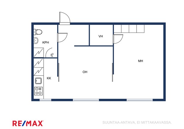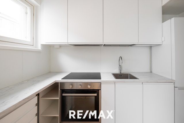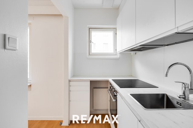 - Vuonna 2024 uusitun keittokomeron varustukseen kuuluu jääkaappipakastin, astianpesukone (45 cm), liesitaso sekä erillisuuni. Keittiön lattia on laminaattia, seinät on maalattu, työtaso on laminaattia. Keittokomerossa on ikkuna. Liukuovi erottaa keittokomeron olohuoneesta.