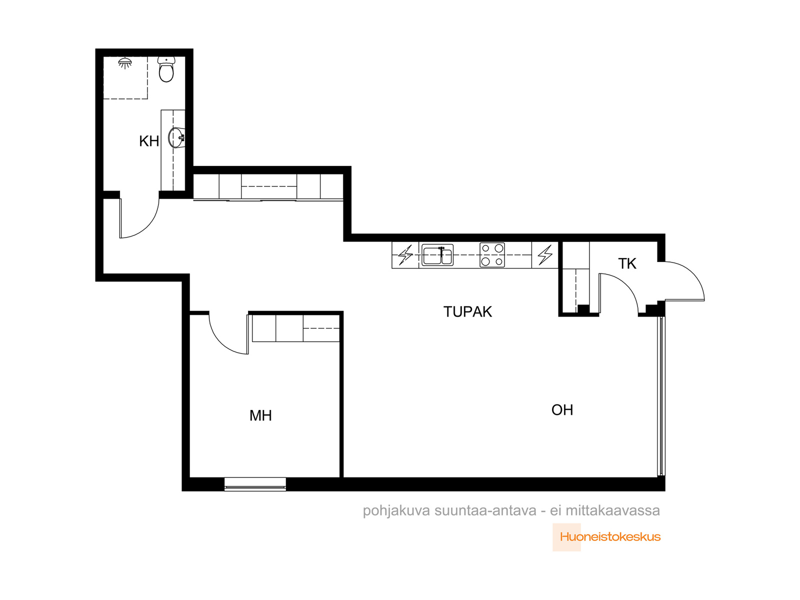 - Edellä mainittu pinta-ala ei ole tarkistusmitattu ja saattaa tämän ikäisessä kohteessa poiketa olennaisestikin huoneiston nykyisen ja rakentamisaikaisen mittaustapojen ja standardien mukaan laskettavasta pinta-alasta. Huoneiston todellinen pinta-ala voi siis olla yhtiöjärjestyksessä, isännöitsijäntodistuksessa ja esitteessä mainittua pienempi tai suurempi. Asunto on tehty vanhasta liiketilasta ja tuo 1h, k on harhaanjohtava, asunnossa on niin iso olohuone että myynnillisesti puhutaan kaksiosta.