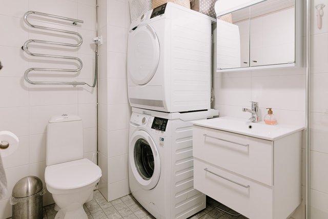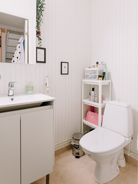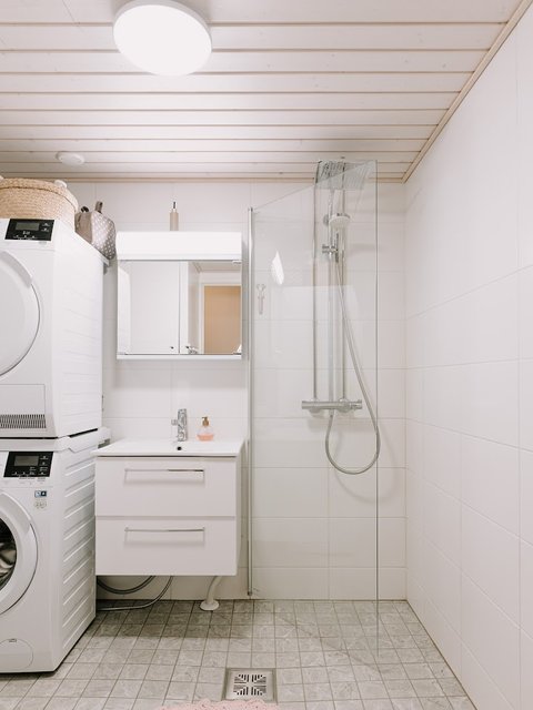 - Suihkuseinä, pesukoneliitäntä, lattialämmitys, wc-istuin, suihku, ja peilikaappi