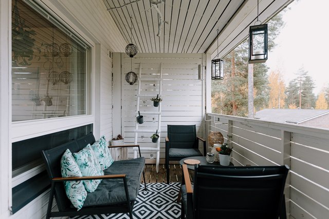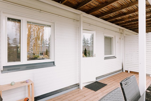 - Olohuoneesta käynti tilavalle parvekkeelle, alakerrasta käynti terassille.