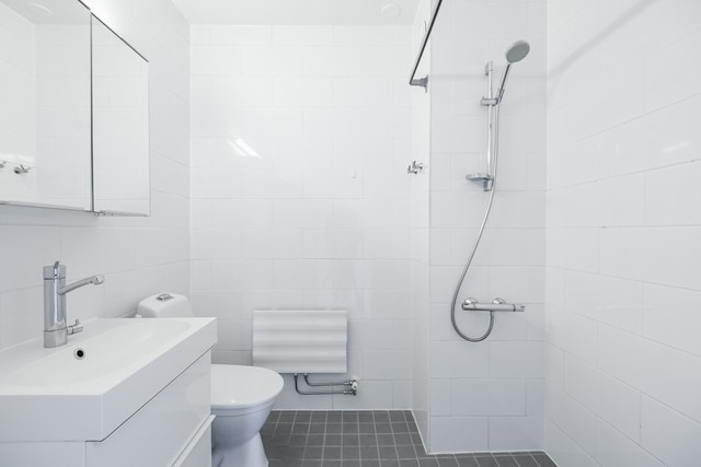 - WC-istuin, suihku, pesukoneliitäntä, peilikaappi, pesuallas, allaskaappi, ja bidee-suihku
