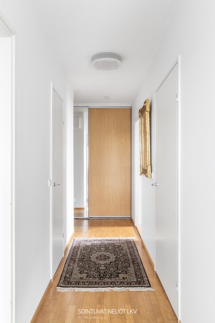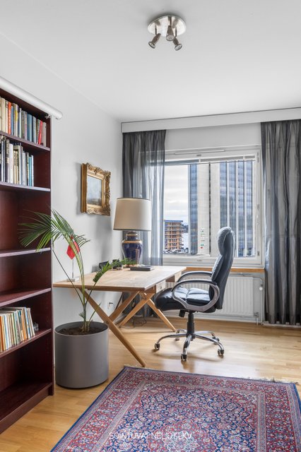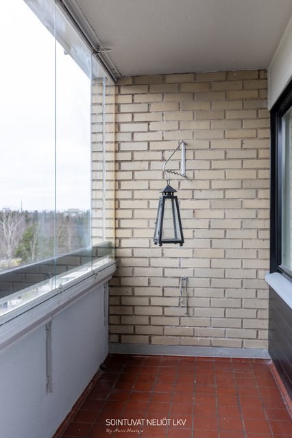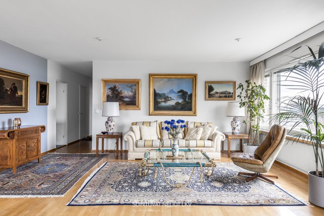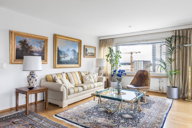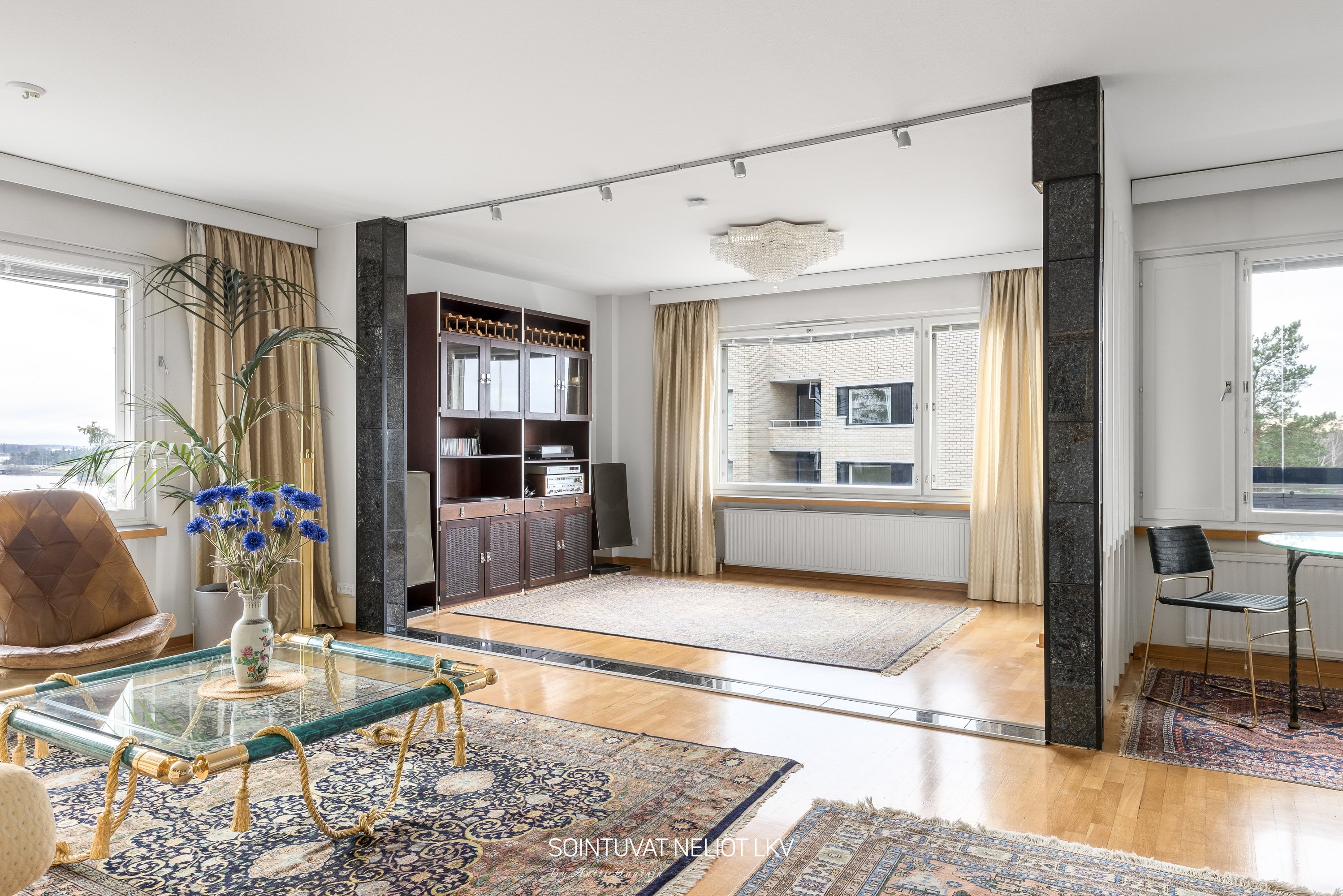 Kodin ydin on ihastuttavan avara olohuone, johon yhdistyy sulavasti myös ruokailutilta. Oleskelutilojen jatkeena on lounaaseen suuntaava lasitettu parveke vehrein ja merellisin näkymin. Asunnon suuret ikkunat tekevät sisätiloista miellyttävän valoisat, mitä korostaa toiseksi ylin asuinkerros. Kulku ylös on vaivatonta, sillä rakennus on varustettu hissillä.