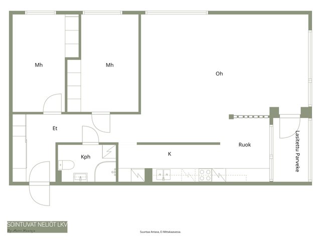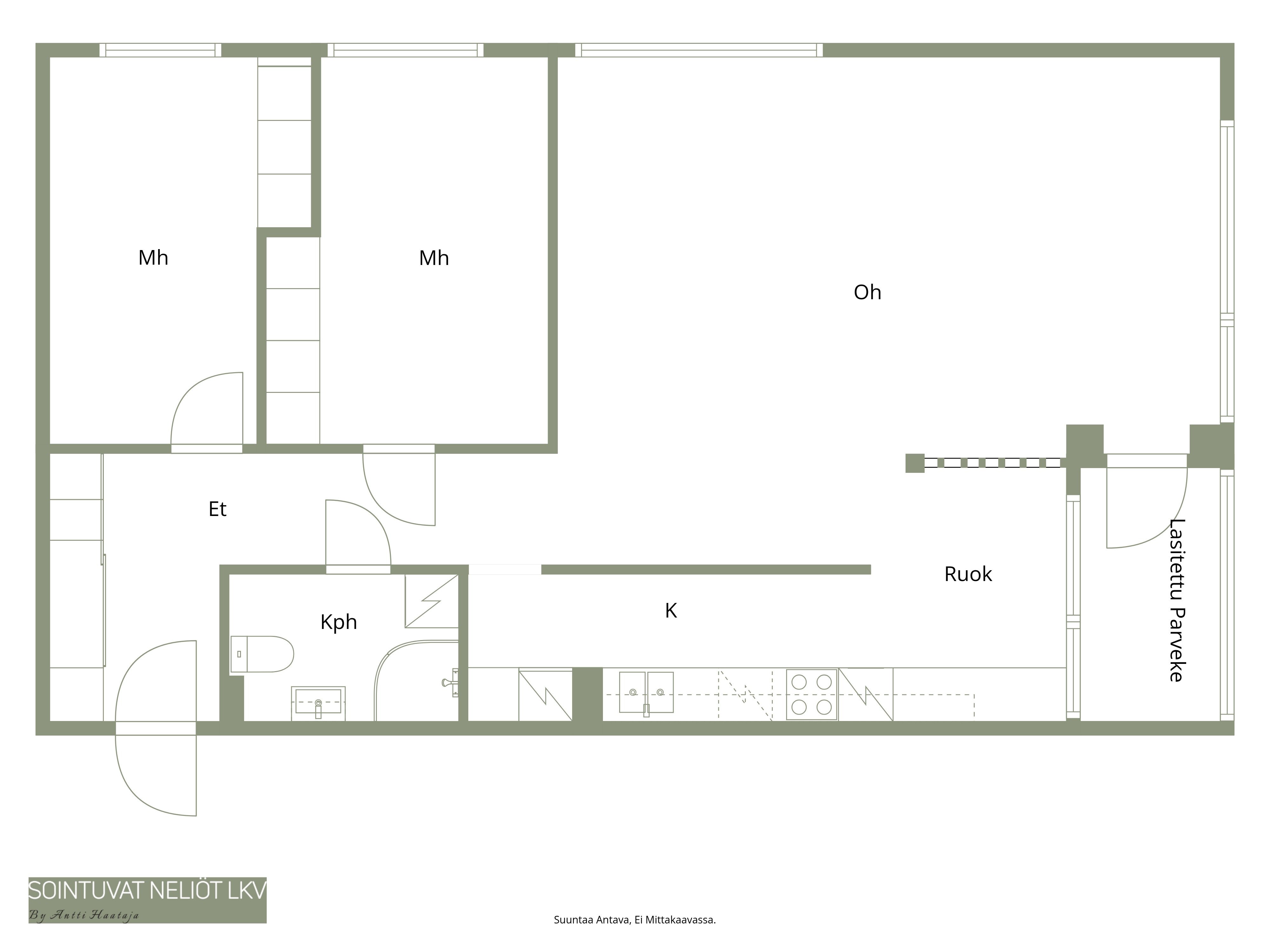 - Ei tarkistusmitattu. Pinta-alat saattavat tämän ikäisissä kohteissa (yhtiö rekisteröity ennen 01.01.1992) poiketa olennaisestikin asuinrakennusten nykyisten mittaustapojen ja standardien (SFS 5139) mukaan laskettavasta asuintilojen pinta-alasta. Pinta-ala voi siis olla edellä mainittua pienempi tai suurempi.