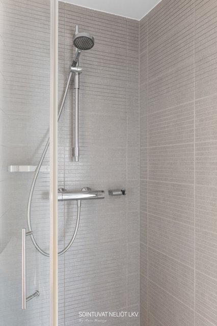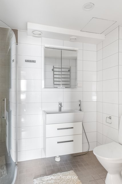 - WC-istuin, suihku, suihkuseinä (2 kpl, kääntyviä), bidee-suihku, vesikiertoinen pyyhekuivain, pesukoneliitäntä, peilikaappi, pesuallas, allaskaappi (Vetolaatikoin), ja lattialämmitys (Vesikiertoinen)