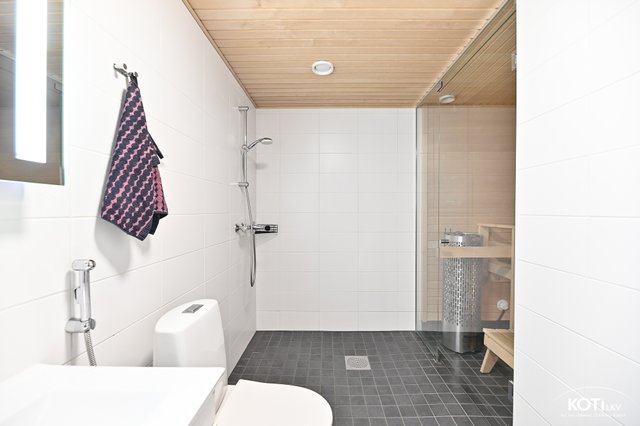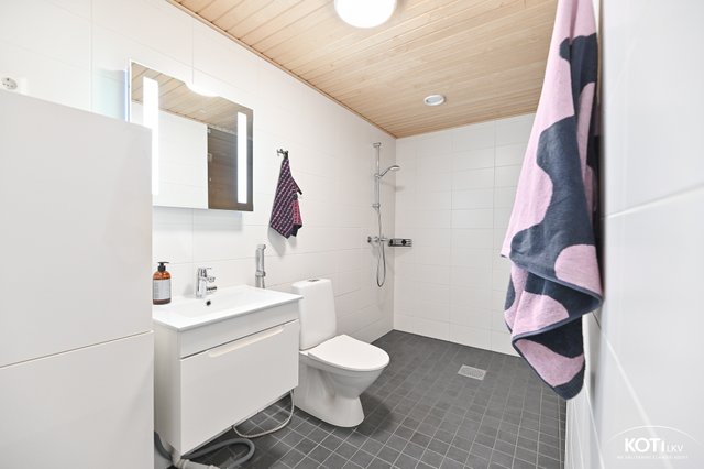 - WC-istuin, suihku, lattialämmitys, bidee-suihku, allaskaappi, peili, pesukoneliitäntä, ja pyykkikaappi