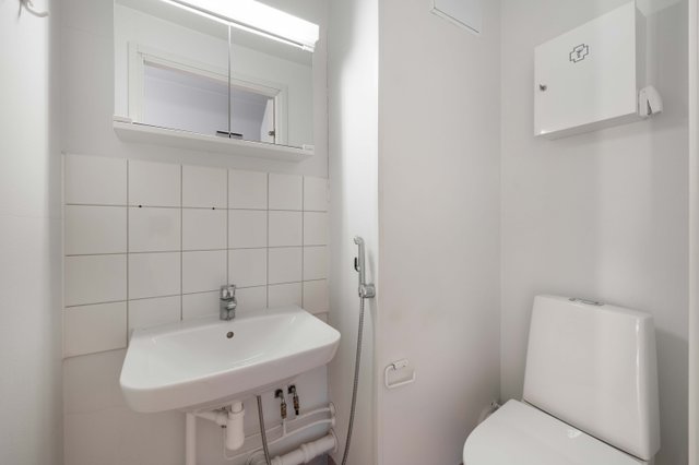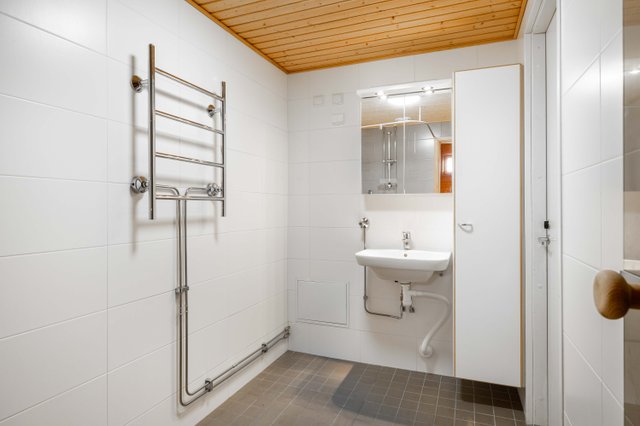 - Suihku, peilikaappi, pesukoneliitäntä, pesuallas, ja rättipatteri