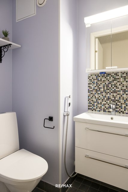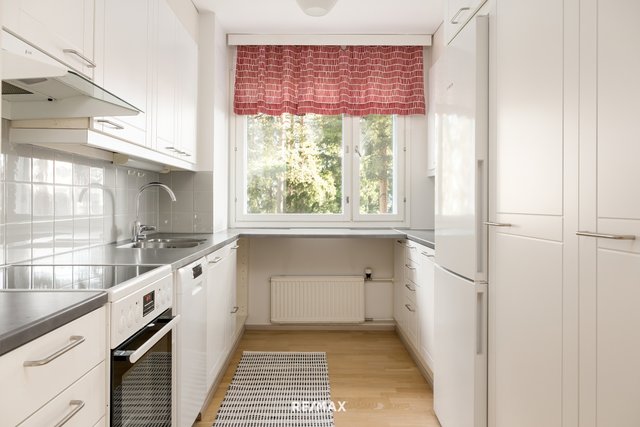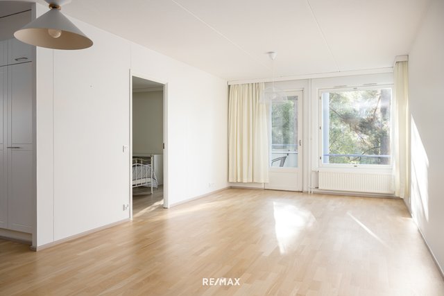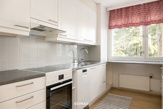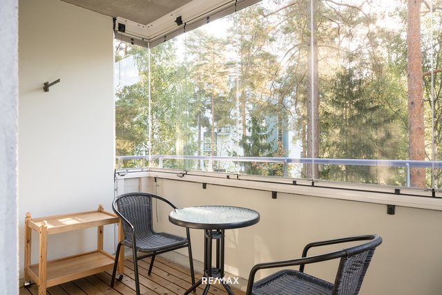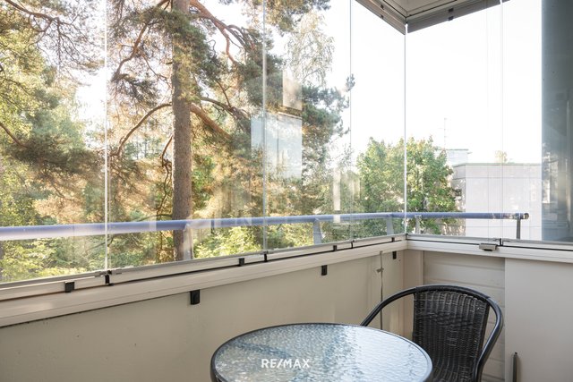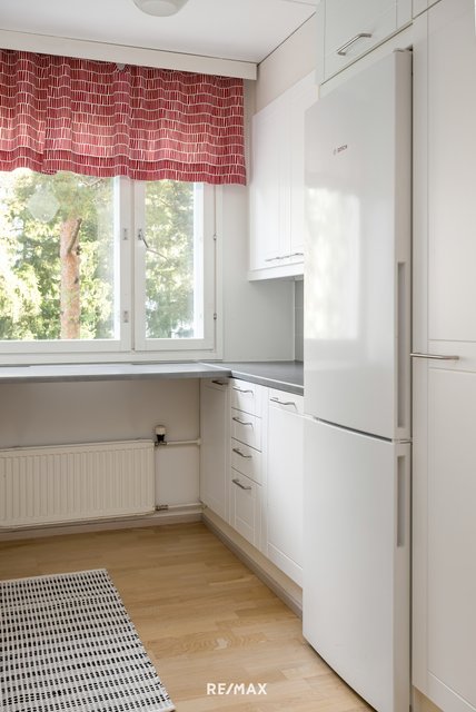 Pohjaratkaisu on erinomainen. Ajattoman valkoiseen keittiöön valoa tuo iso ikkuna ja kaikki on kätevästi käden ulottuvilla. Ruokailutila on saumattomasti olohuoneen yhteydessä. Tilava lasitettu parveke toimii viihtyisänä lisähuoneena pitkälle syksyyn. Asunnon pinnat ovat kauniisti pidetyt, eikä kulumisen merkkejä juuri näy. Vuonna 2019 remontoitu kylpyhuone on tyylikäs ja sen yhteydessä oleva sauna kruunaa arjen rentoutumishetket. Lisäksi erillinen wc eteisestä tuo lisää käytännöllisyyttä arkeen.