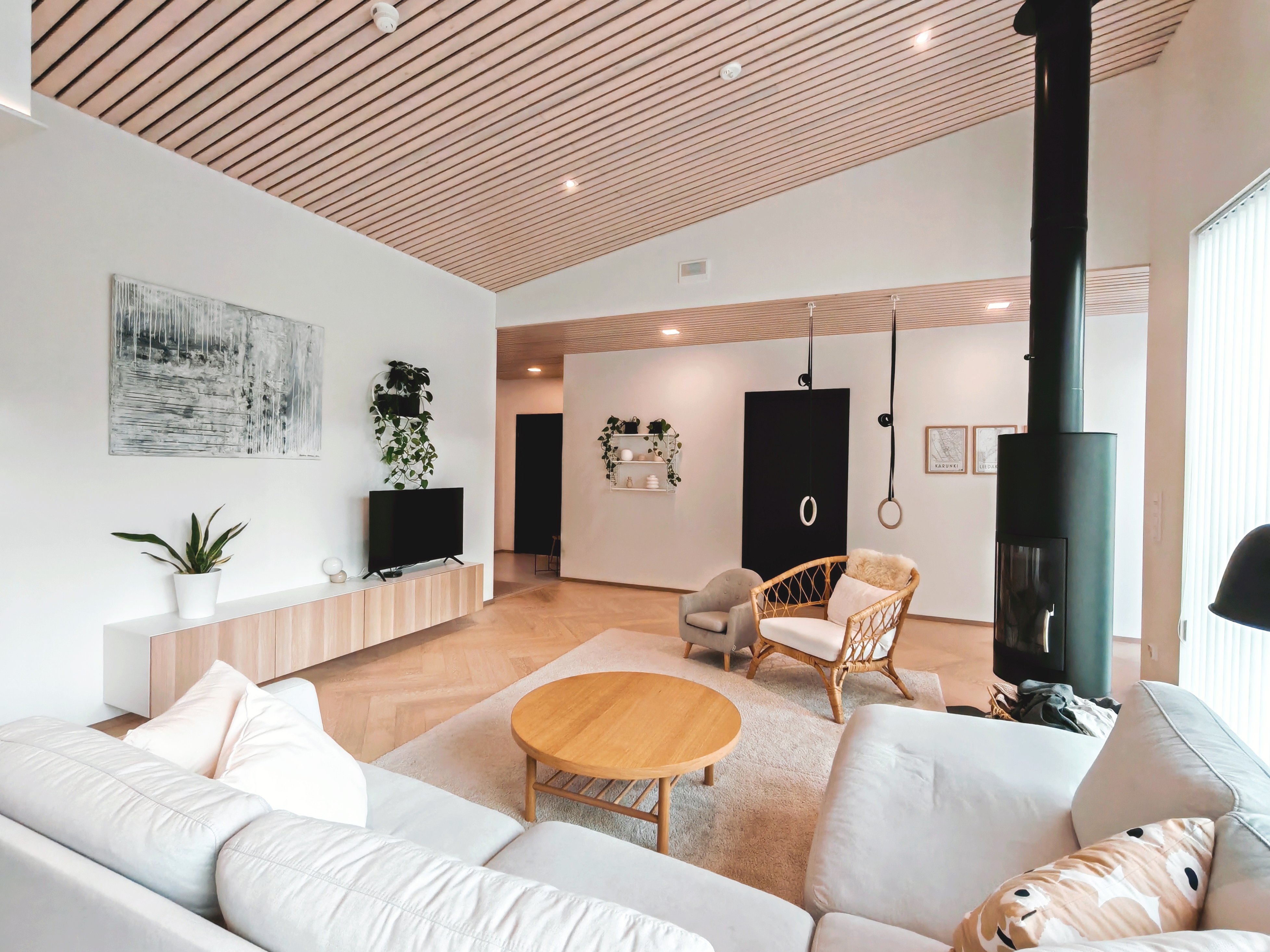 - Korotettu sisäkatto, valkovahattu akustoiva rimakatto, takka (Linnatuli Piccolo)