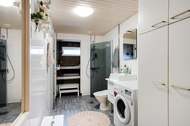 - Allaskaappi, wc-istuin, pesukoneliitäntä, suihkuseinä, peili, lattialämmitys, suihku, ja kiinteät valaisimet