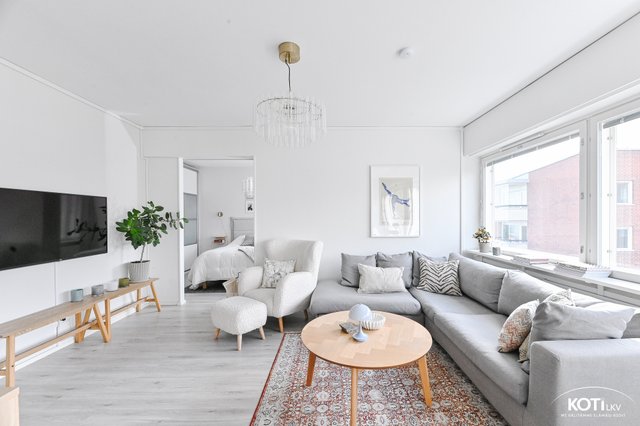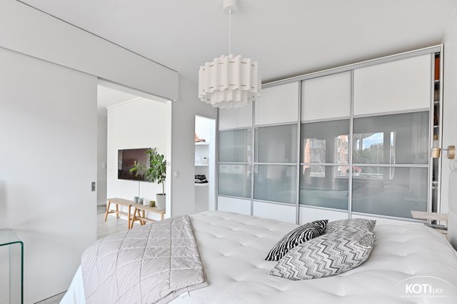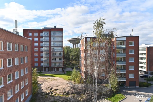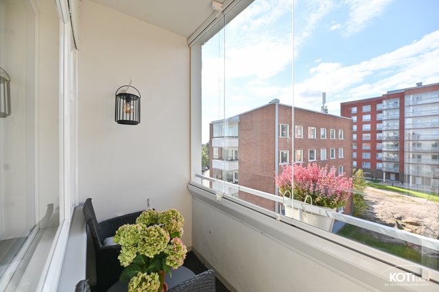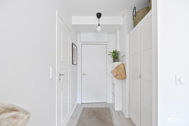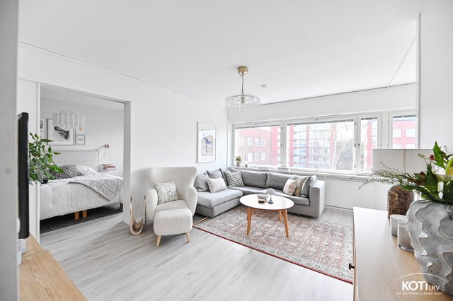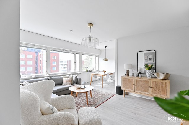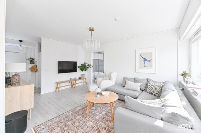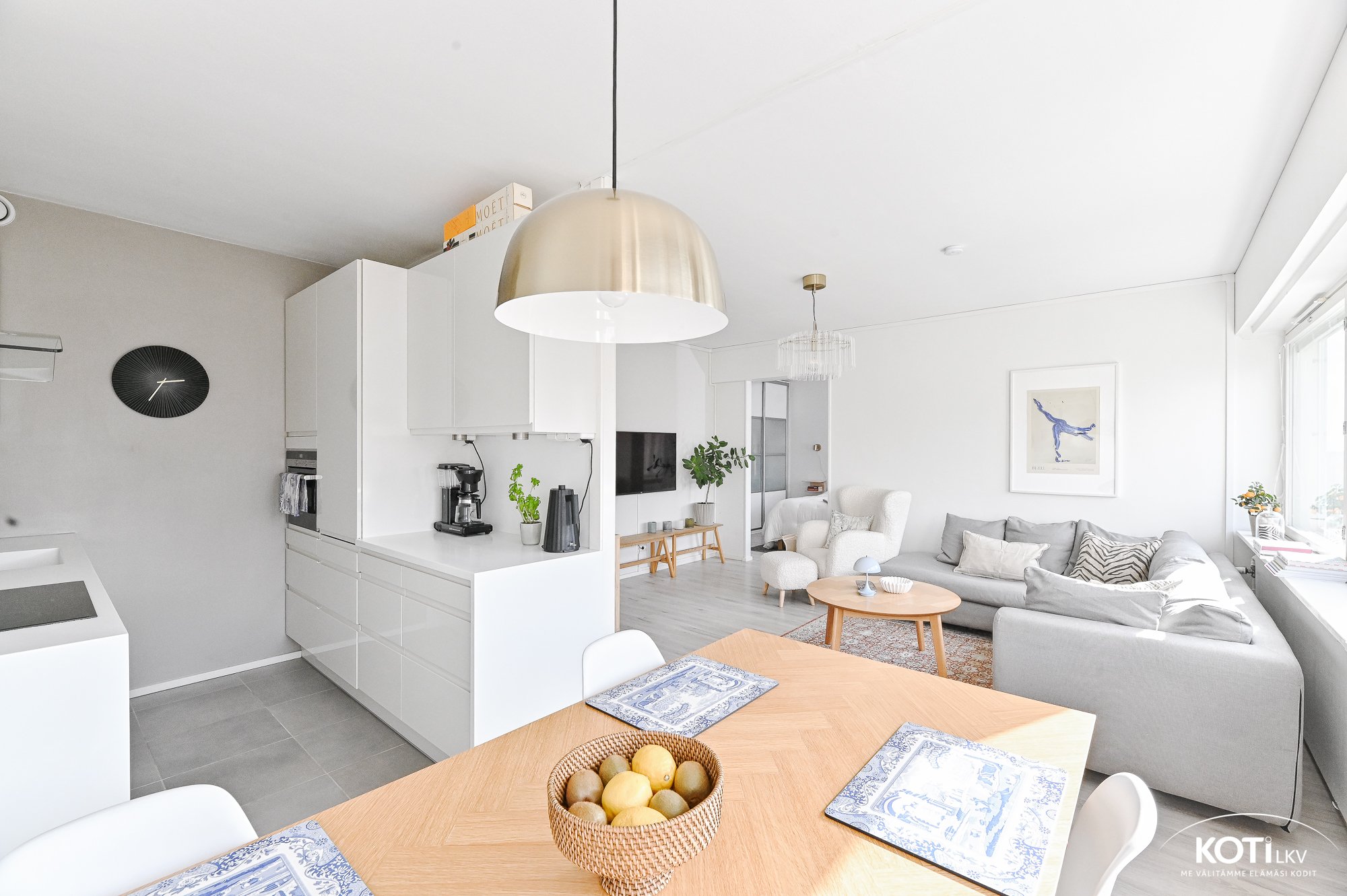 Pohjaratkaisu on erittäin toimiva: avara olohuone yhdistyy ruokailutilaan ja laadukkaaseen HTH-keittiöön muodostaen yhtenäisen kokonaisuuden. Tyylikäs kylpyhuone on uusittu putkiremontin yhteydessä v. 2021. Tilavassa makuuhuoneessa on runsaasti kaappitilaa sekä vaatehuone ja sieltä on käynti lasitetulle parvekkeelle, josta aukeavat kauniit ja vehreät näkymät.