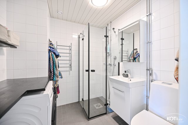 - WC-istuin, suihku, suihkuseinä, pesuallas, allaskaappi, pesukoneliitäntä, peilikaappi, bidee-suihku, ja pyyhekuivain