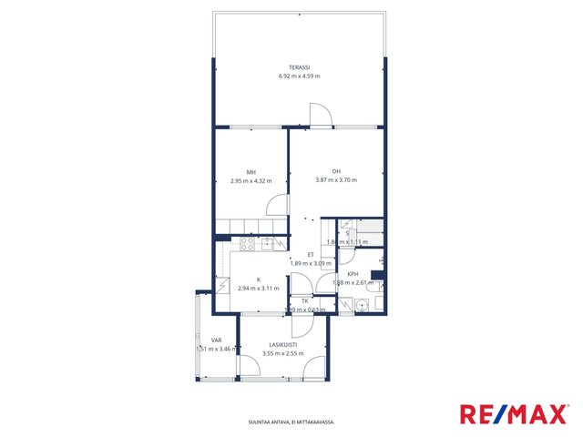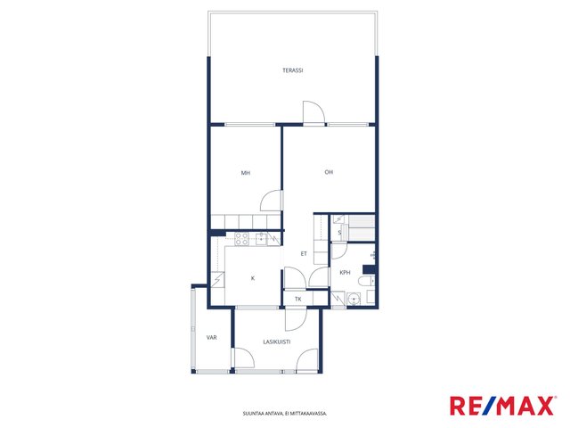 - Oma huoneistokohtainen varasto on ulko-oven läheisyydessä. Varastoon käynti lasitetulta etuterassilta.