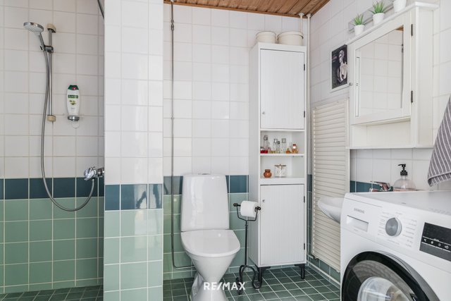 - Suihku, wc-istuin, pesukoneliitäntä, lattialämmitys, peilikaappi, ja pesuallas