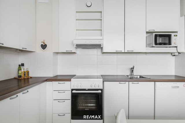 Kaksio kätkee sisälle tilavan erillisen keittiön, johon mahtuu isokin