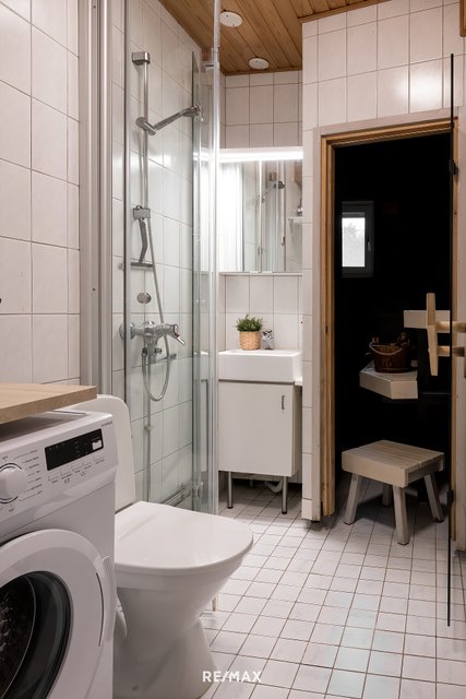 - WC-istuin, suihku, suihkuseinä, pesukoneliitäntä, bidee-suihku, peilikaappi, allaskaappi, ja pesuallas