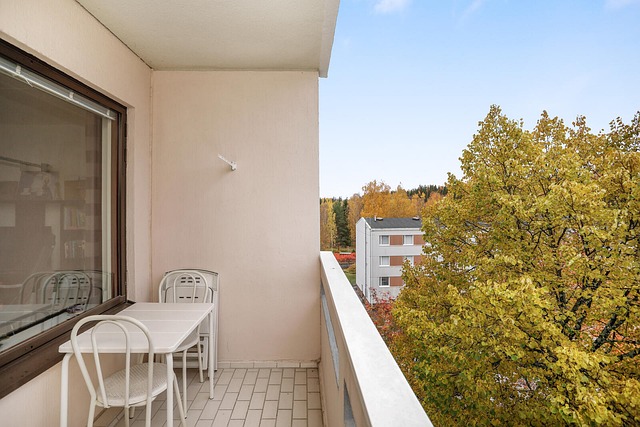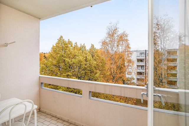 Länsiparveke, joka on mahdollista lasittaa. Ei suoraa näköyhteyttä toisiin taloihin.