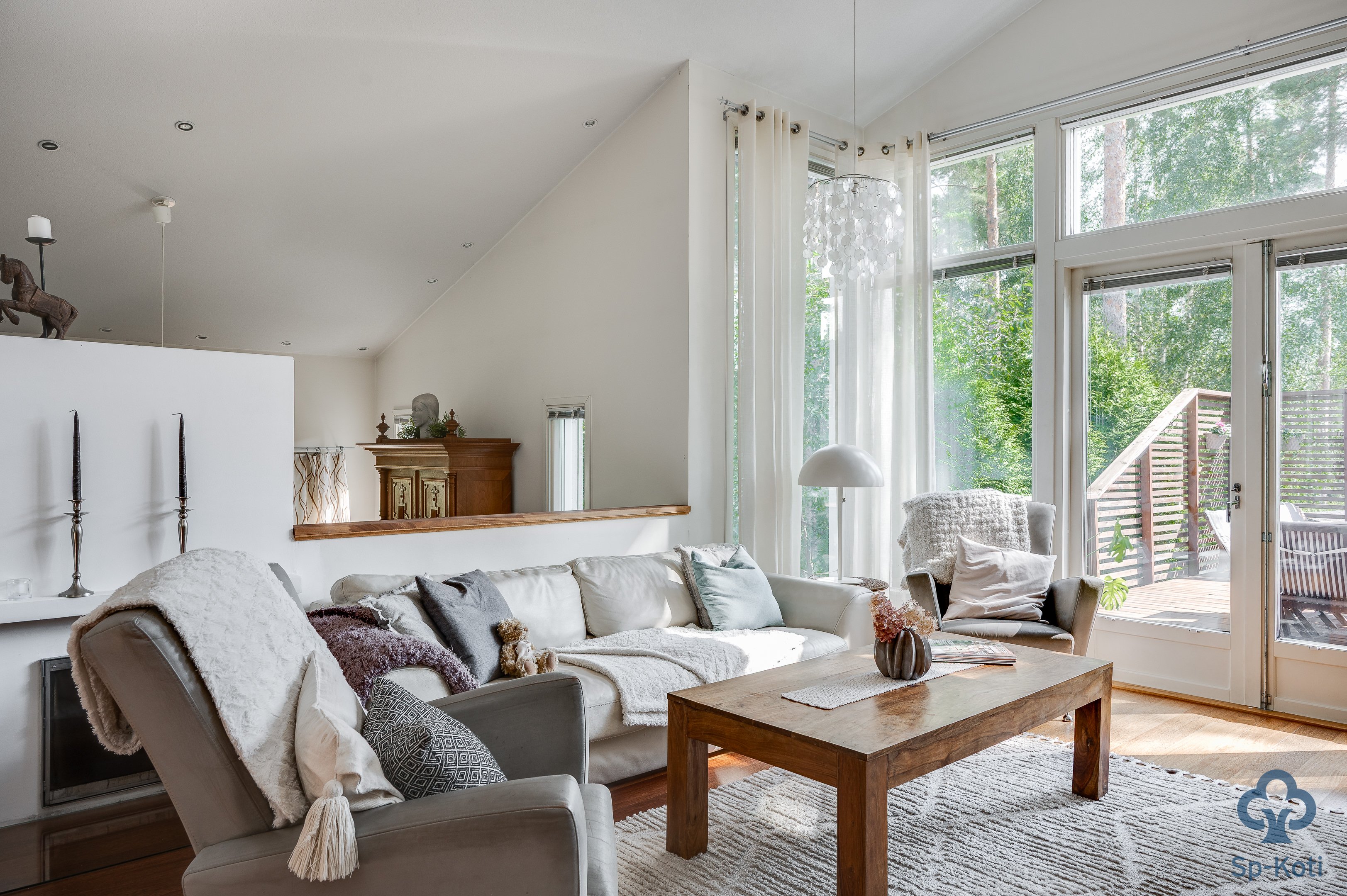 Arkkitehdin kosketuksen huomaa helposti, myös siinä, että katonrajaan on sijoitettu ikkunoita tuomaan valoa korkealta, jolloin valon kulku eri suunnista maustaa kotia luonnonvalolla mielekkäästi.