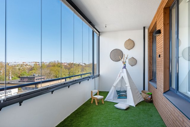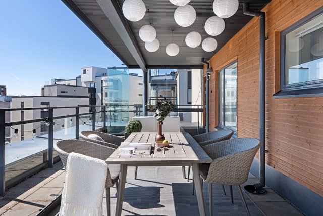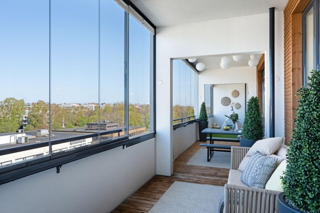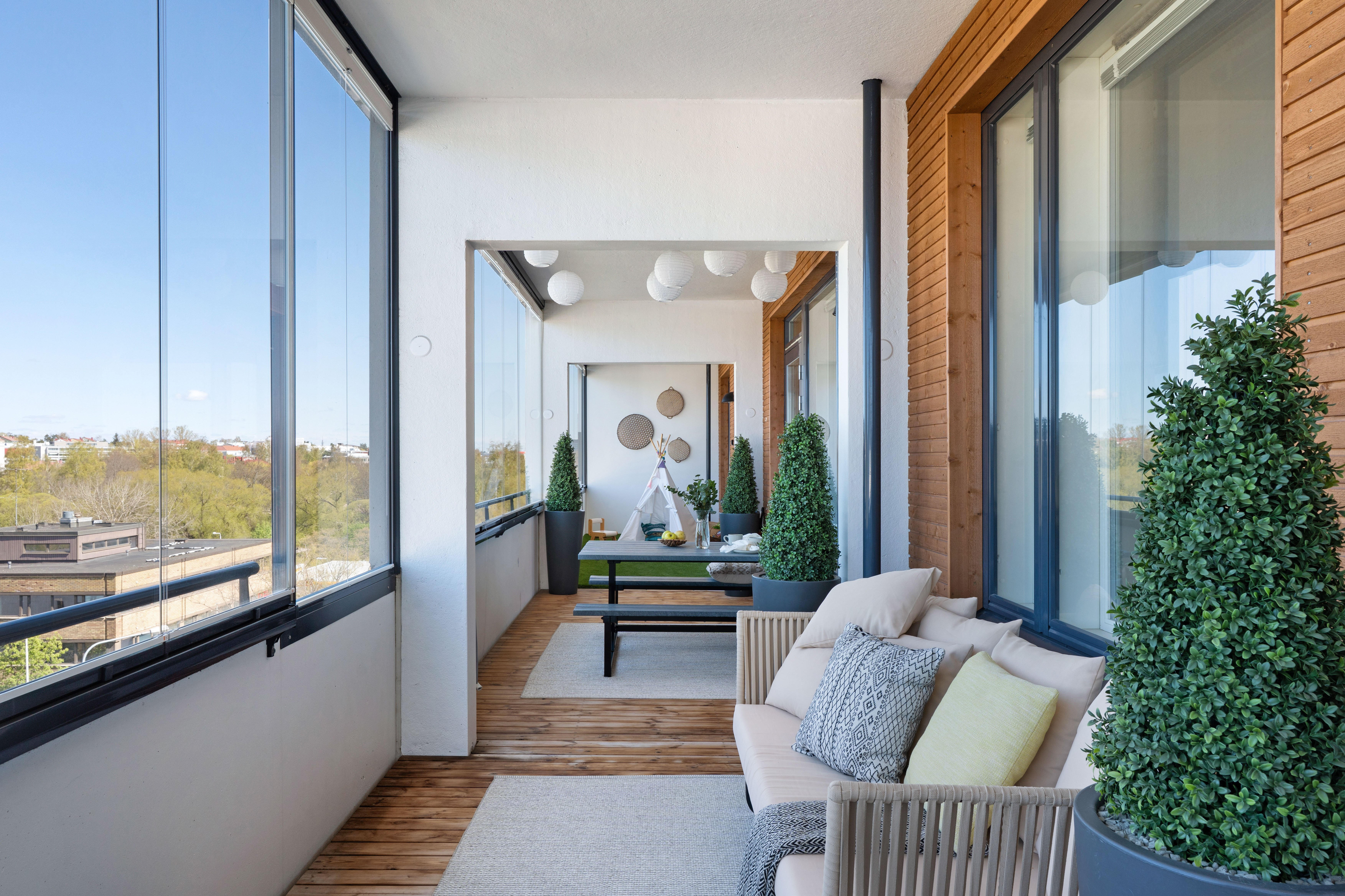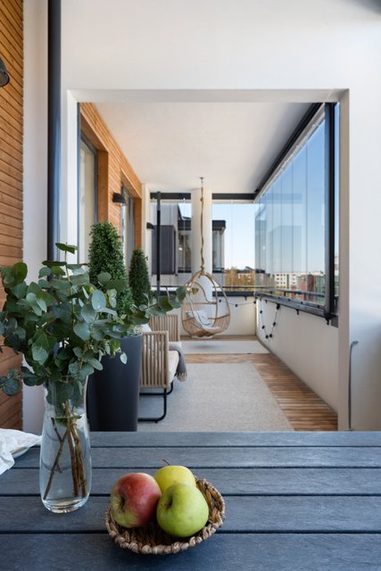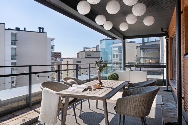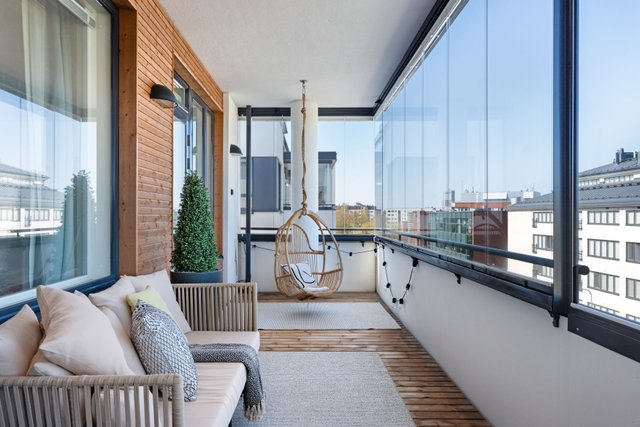 Asunnon avaruus upeine kuudennen kerroksen läpitalon näkymineen viehättää heti ovelta sisään astuttaessa, mutta vasta koko huoneiston levyiselle, ilta-aurinkoon suuntautuvalle parvekkeelle tai aamupäivän auringossa kylpevälle terassille päästyään voi todeta, että tällä asunnolla on oleskelutilaa huomattavasti enemmän kuin mitä yhtiöjärjestys kirjaa. Sekä parveke, että osa terassista on lasitettu, mahdollistaen niiden käytön aikaisesta keväästä myöhäiseen syksyyn.