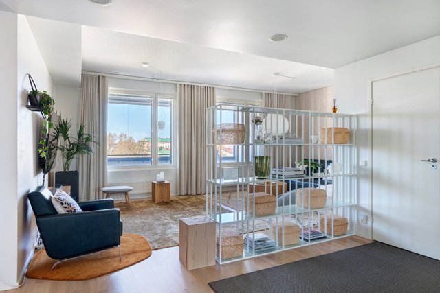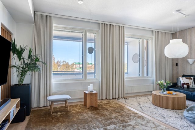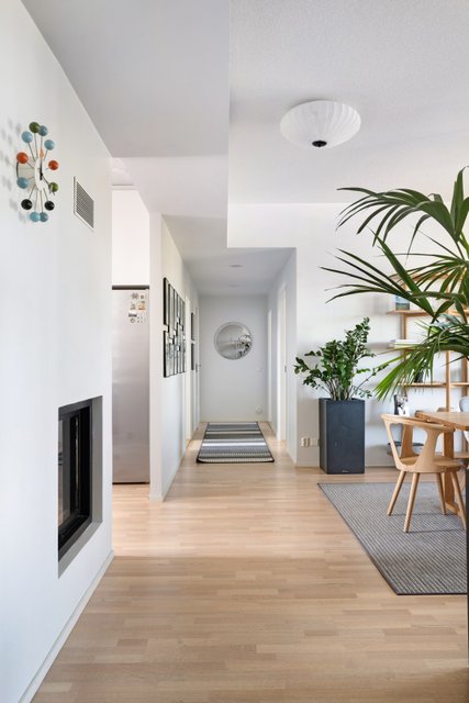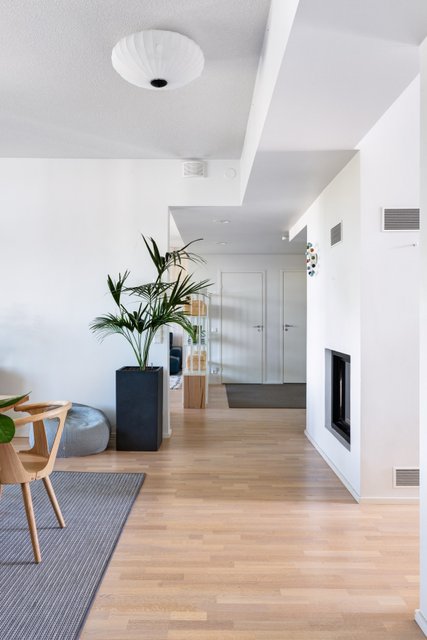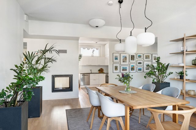Koti palvelee täydellisesti pientä perhettä, mutta toimii loistavasti myös pariskunnan asuntona. Tilat ovat väljiä ja monikäyttöisiä, ikkunat poikkeuksellisen suuret. Keittiö ja tilava ruokasali ovat suorassa yhteydessä, molempiin suuntiin avautuvan takan luodessa tunnelmaa. Olohuone paistattelee kauniisti ilta-auringossa, samoin koko asunnon levyinen lasitettu parveke. Pesutilat ovat modernin väljät ja poreammeessa ihana rentoutua päivän päätteeksi.