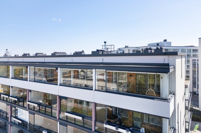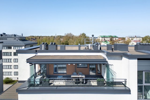 - Erittäin tilava, koko huoneiston levyinen lasitettu parveke ilta-aurinkoon ja lasitettu terassi aamuaurinkoon. Avarat ylimmän kerroksen näkymät.