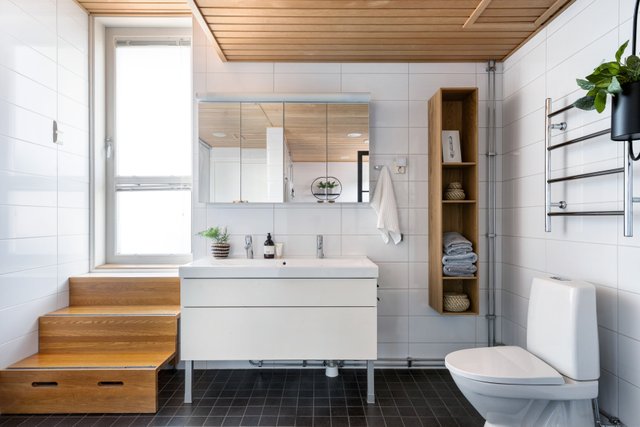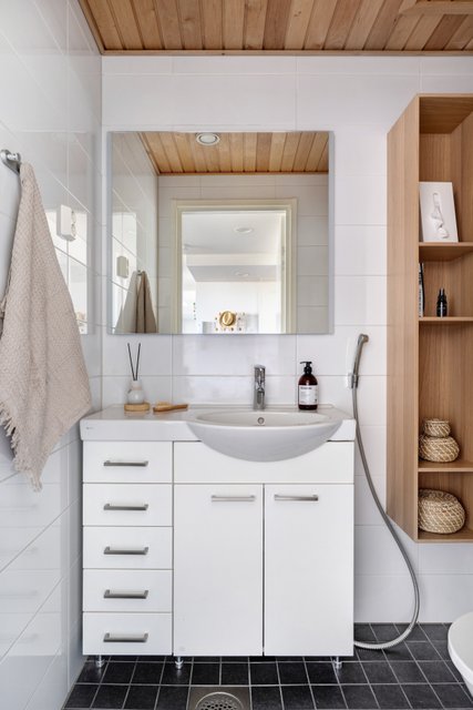 - WC-istuin, suihku, suihkuseinä, lattialämmitys, kiinteät valaisimet, kylpyhuonekaapistot, pesukone, kuivausrumpu, peilikaappi, poreamme, pesukoneliitäntä, allaskaappi, ja pesuallas