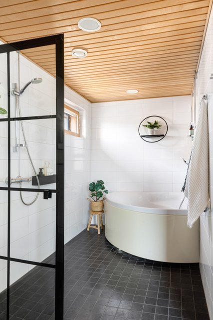 - Iso kylpyhuone, jossa poreamme. Kulku suoraan lasitetulle terassille.