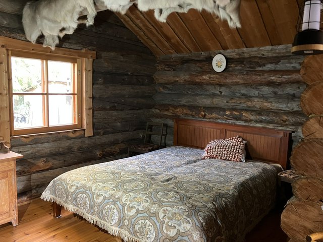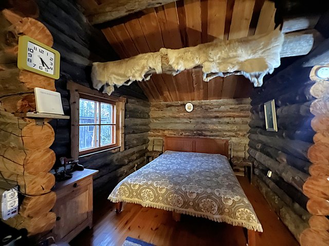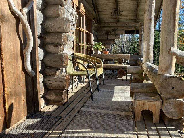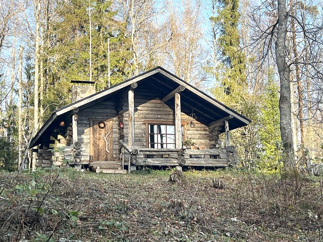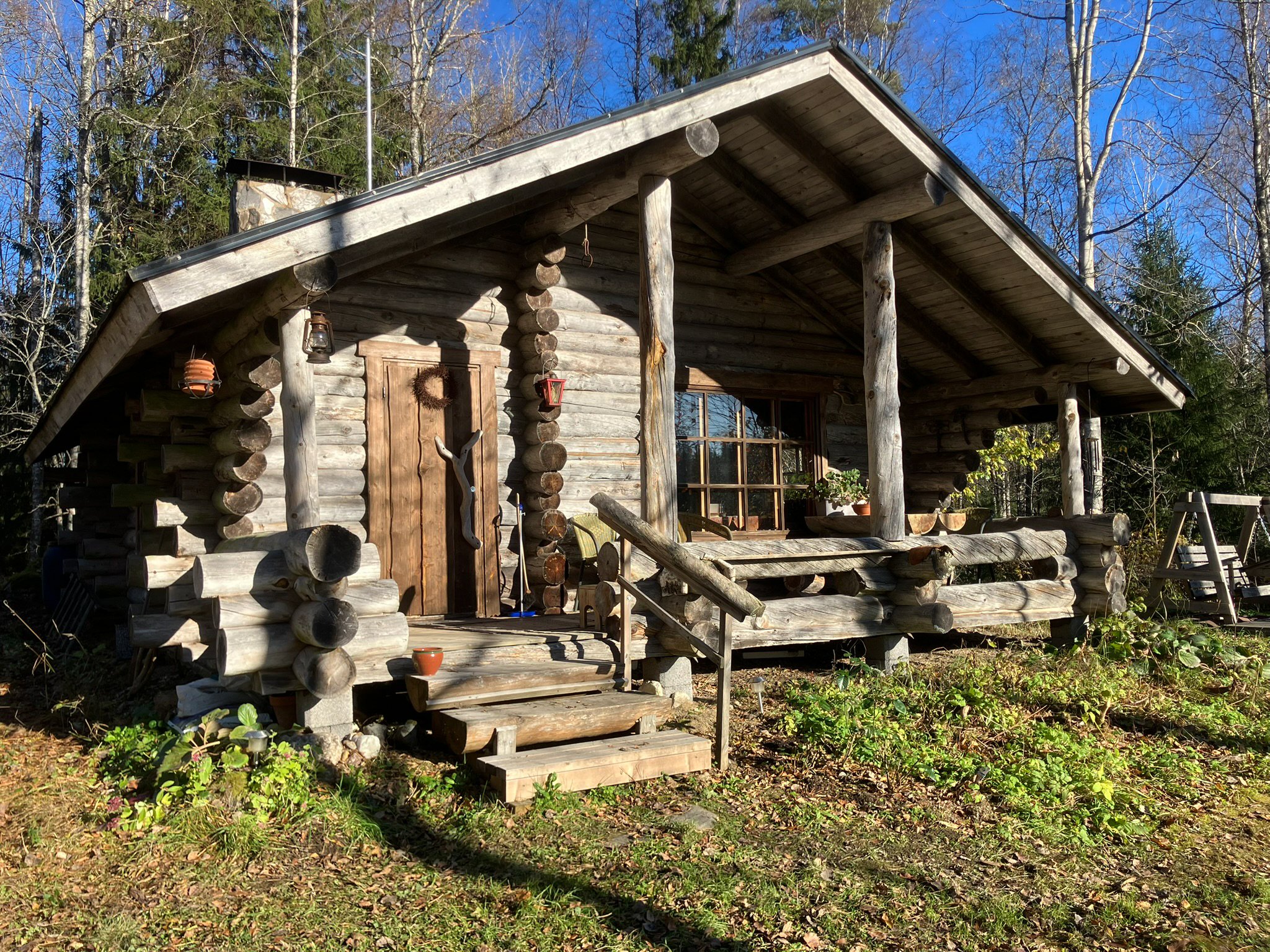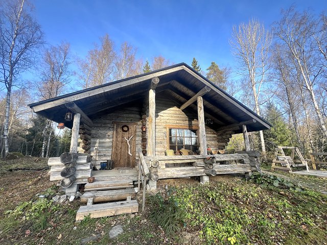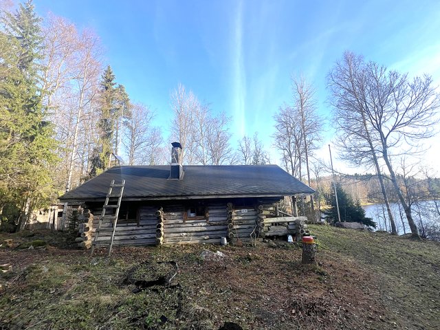 Erähenkinen kelohirsimökki kauniilla järvinäkymillä