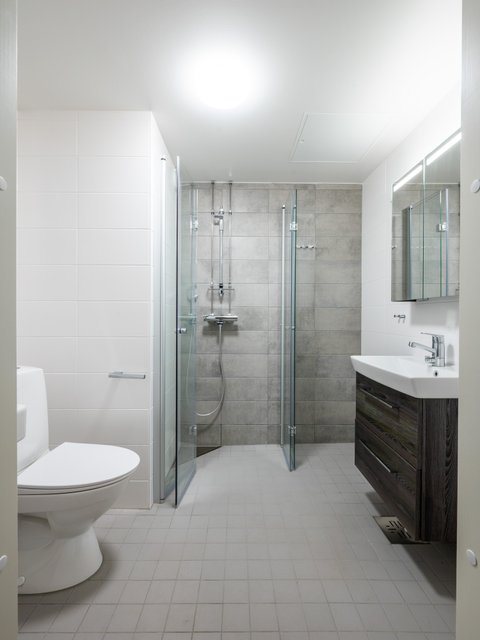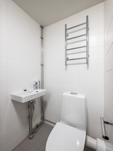 - WC-istuin, suihku, suihkukaappi, pesukoneliitäntä, peilikaappi, peili, pesuallas, allaskaappi, ja lattialämmitys