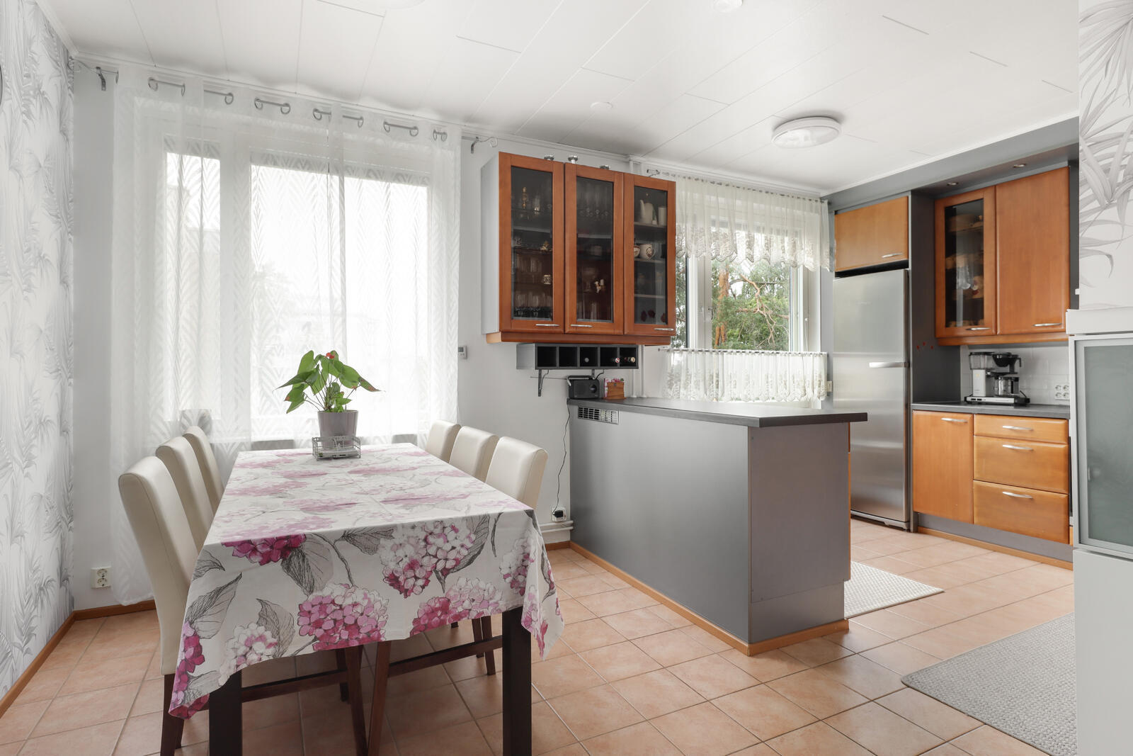 Saarekkeellinen iso avokeittiö, tila isolle pöydälle.