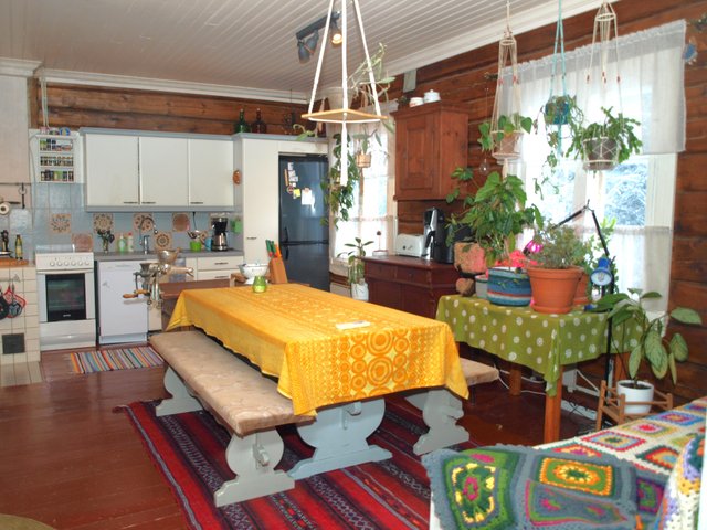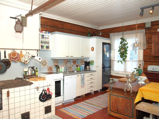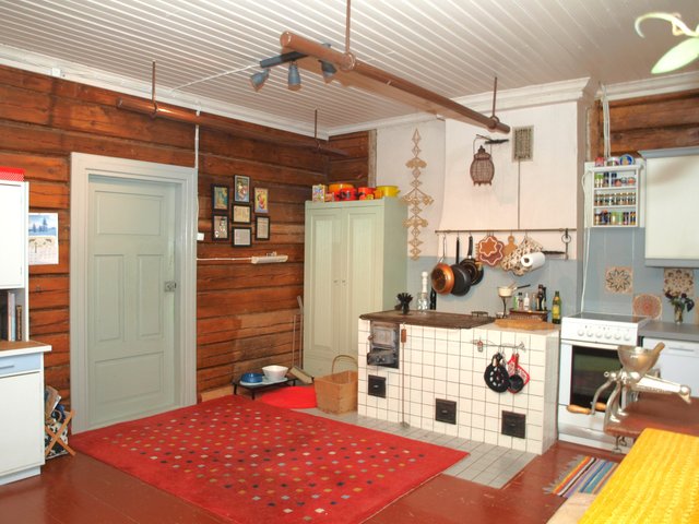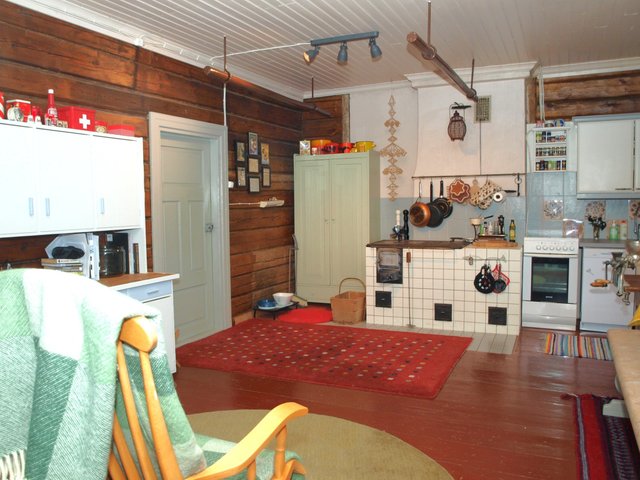 - Vanhan ajan iso tupa, jossa 1 seinällä kiinteät kaapistot, sähkö- ja puuhella ym.