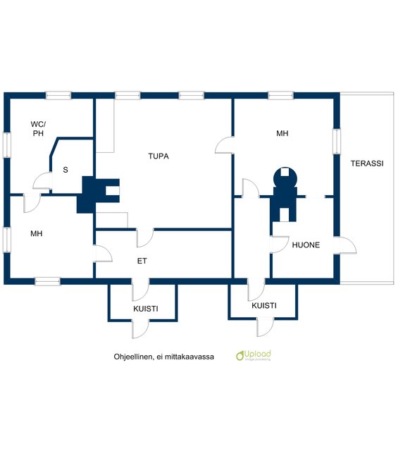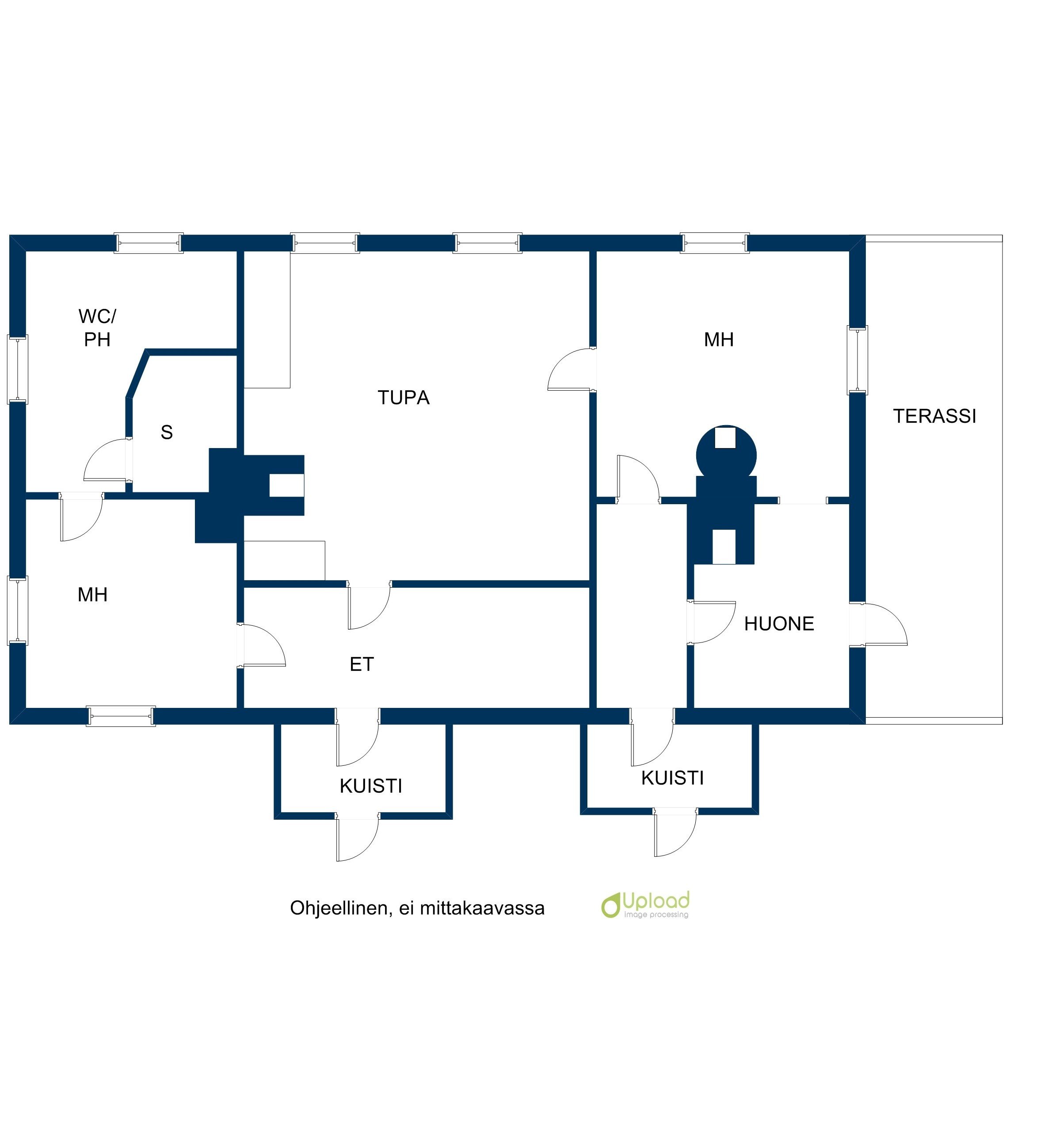 3 h, Tupa/Oh/keittiö, s, ph/WC/kh-tila, eteinen, kuistit ja terassi