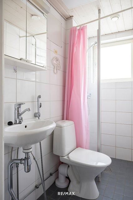 - WC-istuin, suihku, peili, allaskaappi, pesukoneliitäntä, ja suihkuseinä