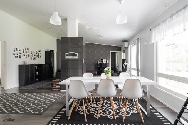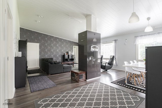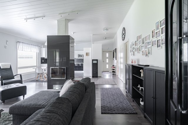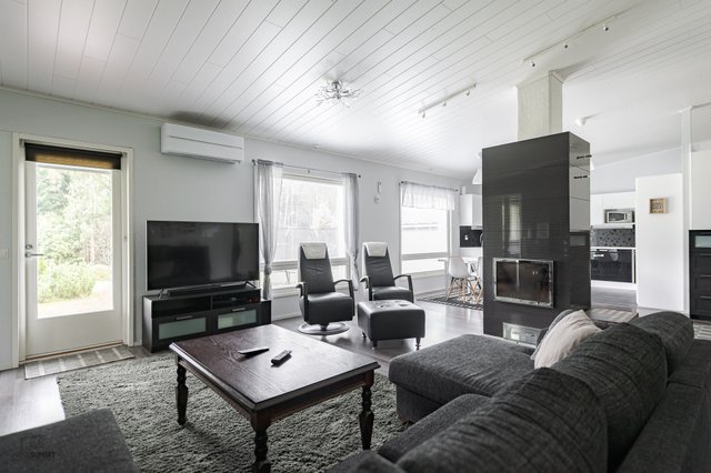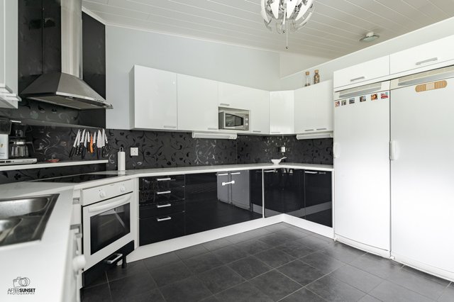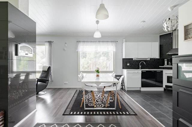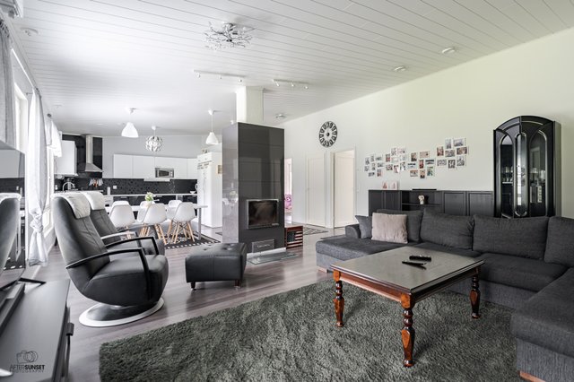 Avara olohuone yhdistyy saumattomasti keittiöön ja eteiseen, luoden yhtenäisen ja valoisan tilan, jossa on korkea vino sisäkatto ja runsaasti luonnonvaloa. Varaava takka ja leivinuuni tuovat tunnelmaa ja lämpöä kylminä talvi/syysiltoina. Tyylikäs avokeittiö on varustettu mustavalkoisilla kaapistoilla ja moderneilla kodinkoneilla, tarjoten runsaasti säilytys- ja työskentelytilaa.