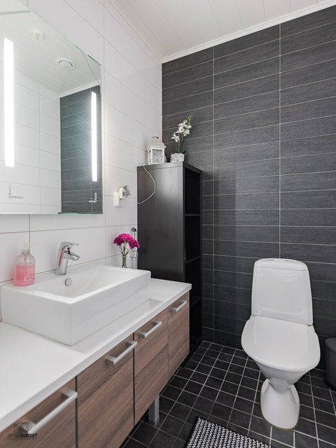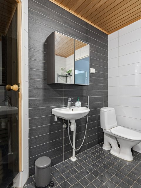 - Runsaasti kaapistotilaa, käsienpesuallas, peilikaappi, wc-istuin, lattiialämmitys, laatoitettu lattia ja seinät.