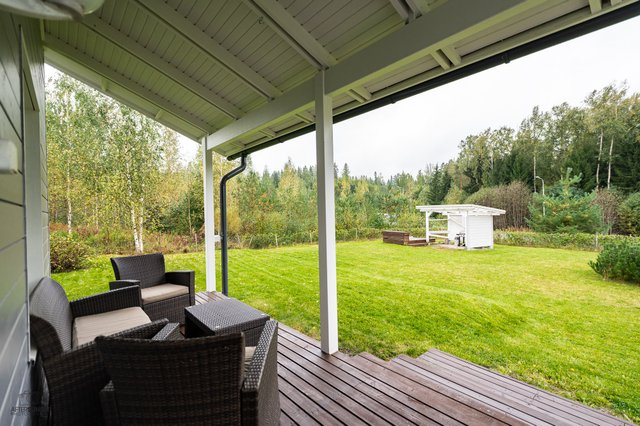 Ulkotiloissa on mukava terassi, joka tarjoaa mahdollisuuden nauttia kesäpäivistä omalla pihalla. Pihapiiri on helppohoitoinen, jossa on tilaa lasten leikeille tai puutarhaharrastuksille.